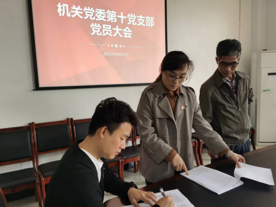 同时,刘承亮传达了机关党委10月份支部书记工作会议精神,宣读了机关党委第十党支部关于补选支部委员的文件精神,明确了选举的有关要求,并按照选举办法和无记名投票结果,补选张先杰、雷婷婷两位同志作为支部委员,并选举张先杰为党支部副书记,雷婷婷担任支部纪检委员。