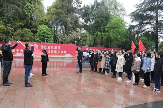 细雨绵绵,寄托无限哀思。在红军烈士纪念碑前,全体党员怀着无比崇敬的心情,向革命先烈敬献花篮、鞠躬致敬,并面向党旗庄严宣誓,重温入党誓词。随后,在讲解员的引领下,全体党员瞻仰了红军烈士浮雕、烈士名录墙、邓萍烈士墓和红军坟,聆听了在遵义战役中英勇牺牲的邓萍同志和“红军菩萨”卫生员龙思泉的感人故事,回顾了中国共产党艰苦奋斗的历程。在“红色故事大家讲”环节,来自三个支部的6名党员代表分享了红军长征在贵州的故事。在党史知识答题环节,各支部党员踊跃参加,营造了学党史、知党情、跟党走的浓厚氛围。